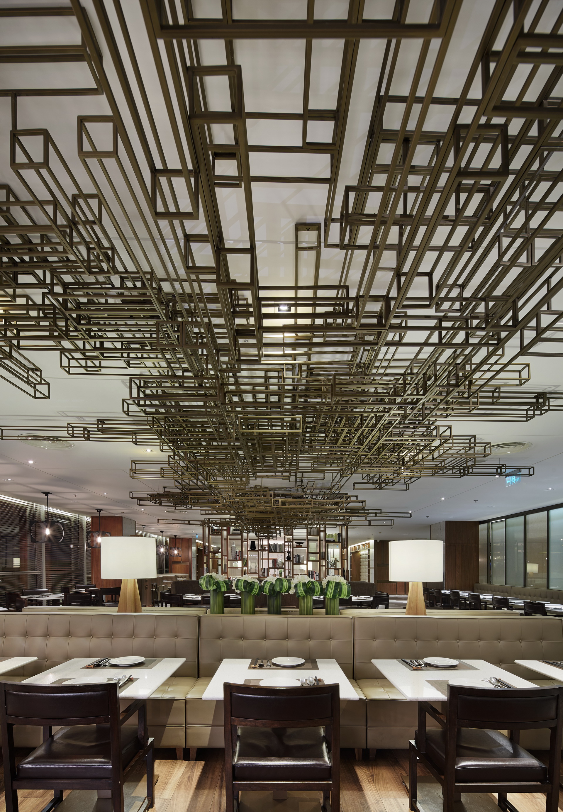 Dining area in modern Hong Kong urban style, Square tube on the Ceiling of main dining area modeling concepts crowded buildings and people.
